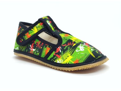 Dětská domácí obuv s praktickou ochranou špičky v podobě gumového okopu. Vyrobené z prodyšných materiálů, s tenkou ohebnou podrážkou a rovnou koženou stélkou. Bez lepidel.