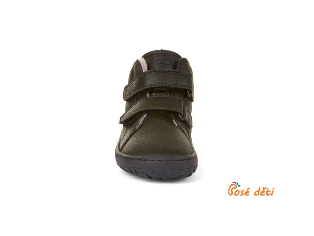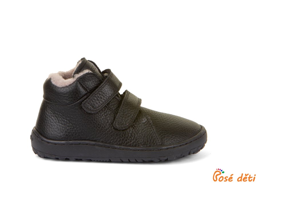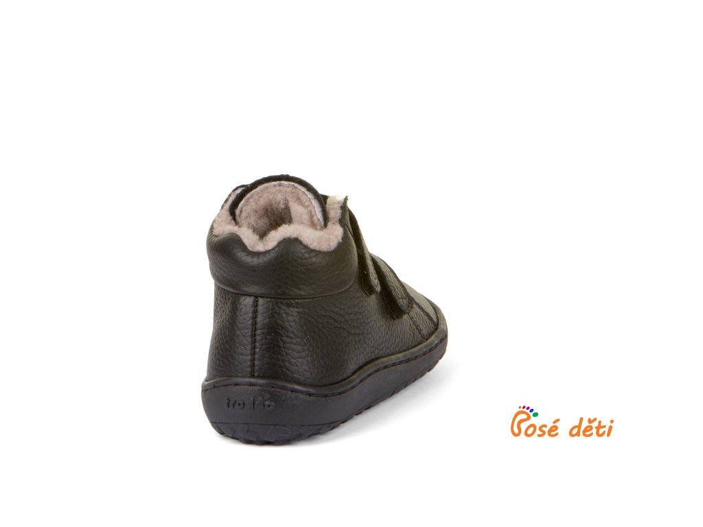 Zimní barefoot obuv chorvatské značky Froddo. Nižší střih nad kotník, svršek z hladké voděodpudivé kůže, podšívka a stélka z jehněčí srsti (sheepskin).
