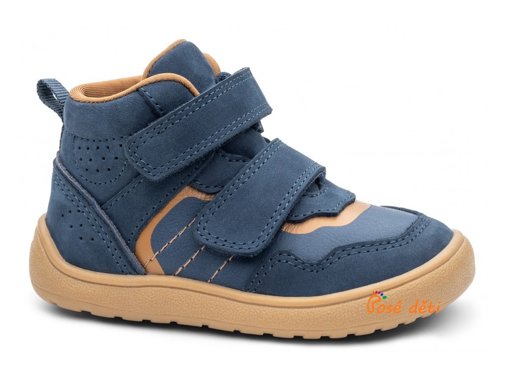 Dětské celoroční kožené boty vyššího střihu, s pružnou tkaničkou a velcrem v horní části. Vyjímatelné rovné stélky, inovovaný tvar podešve (2023) s větším prostorem pro prsty