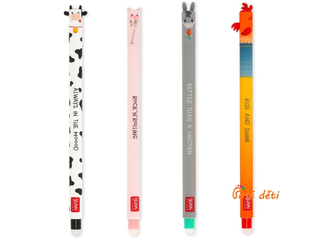 Gumovatelná pera v populárních designech s roztomilými detaily a nápisy. Vyměnitelná náplň.