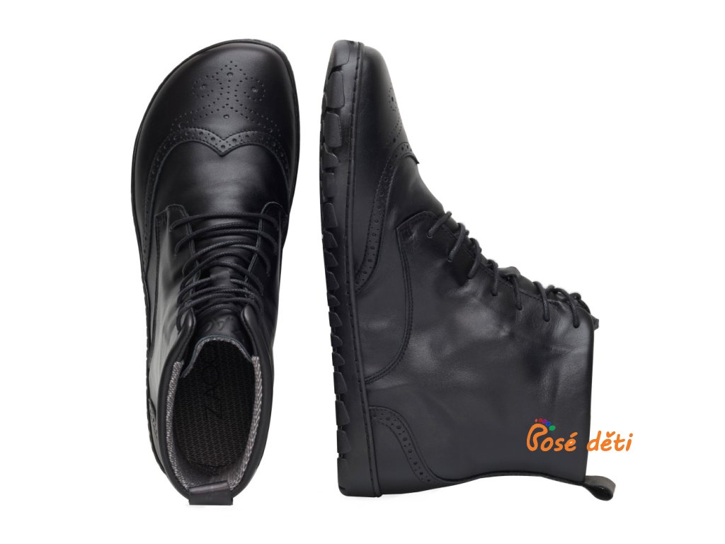 Svrchní materiál tvoří nejjemnější, jemně vyčiněná kůže napa v klasické černé barvě, kde perforované ozdoby a kontrastní detaily dodávají eleganci, vysoký komínek a šněrování zaručí bezpečné, pevné uchycení a optimální podporu pro kotníky i na nerovných cestách.